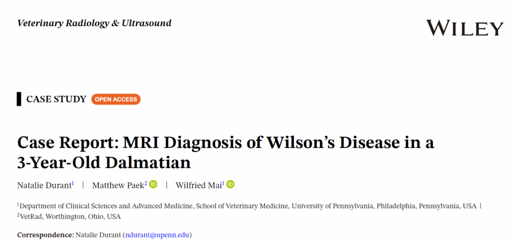 文献来源:Durant N, Paek M, Mai W. Case Report: MRI Diagnosis of Wilson’s Disease in a 3-Year-Old Dalmatian. Vet Radiol Ultrasound. 2025 Sep;66(5):e70087.