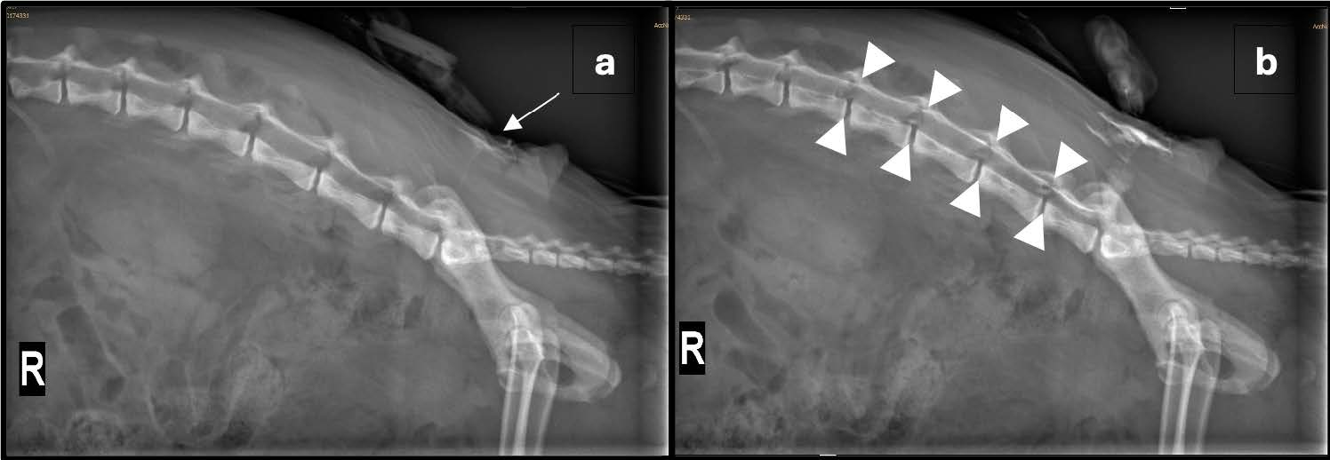 ↑ (a) 右侧位X光片显示椎柱和骨盆的硬膜外导管(箭头)在注入少量造影剂后的位置。(b) 通过硬膜外导管注入0.5 mL非离子型碘化造影剂后的重复右侧位X光片。硬膜外导管的尖端并未清晰显示;通过比较造影前后的图像,可以看到少量的造影剂到达L3-4神经孔(箭头所围区域)。探查性剖腹术后腹部出现了弥漫性不均匀的浆膜细节缺失和多灶性游离气体。