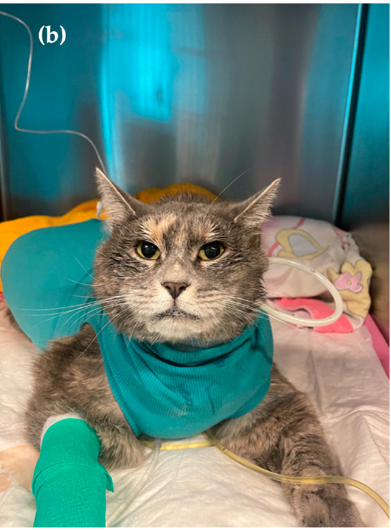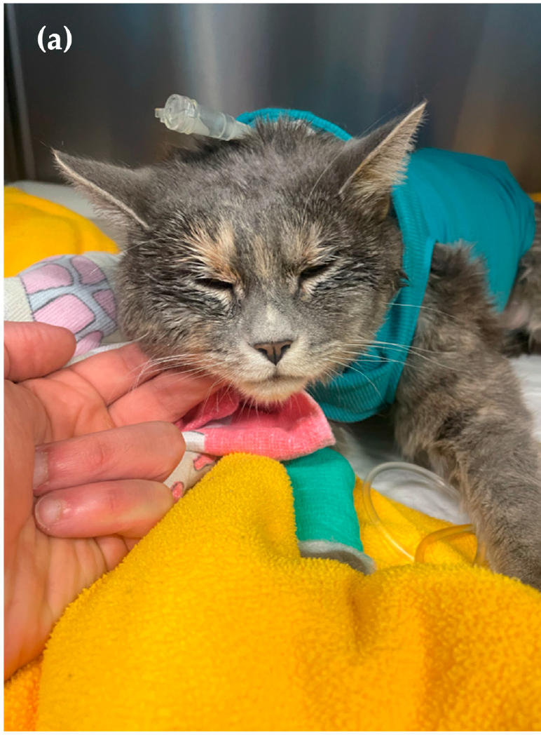 ↑ (b) 在开始0.5%罗哌卡因持续硬膜外腔输注后两小时拍摄的猫的照片。在这张照片中可以观察到明显的流涎。
