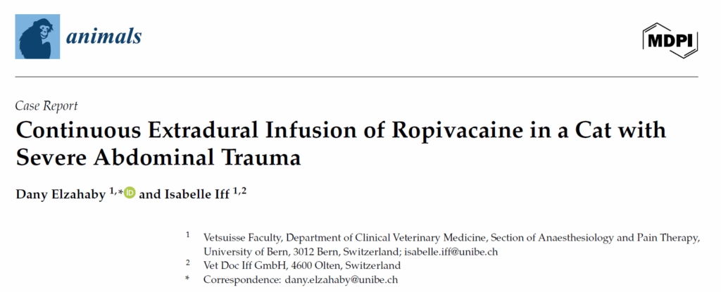 文献来源:Elzahaby D, Iff I. Continuous Extradural Infusion of Ropivacaine in a Cat with Severe Abdominal Trauma. Animals (Basel). 2025 Aug 13;15(16):2378.