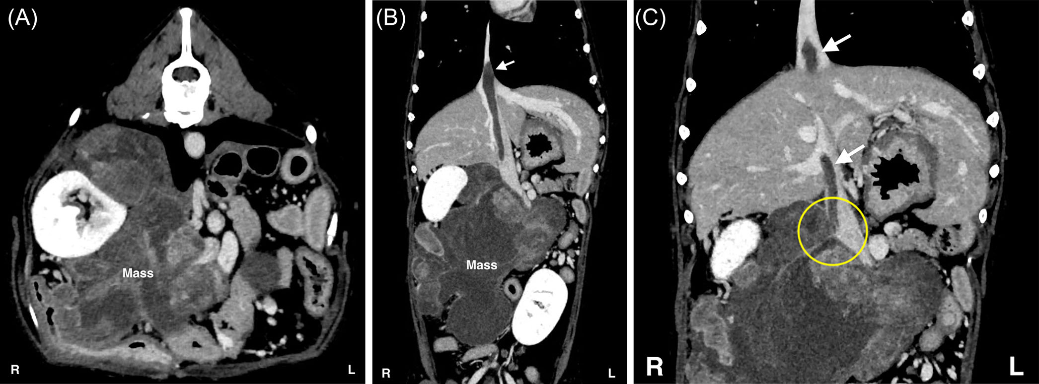 ↑ 术前CT结果。(A)轴位图像。(B)冠状位图像。(C)冠状位图像突出显示腔静脉血栓的起源。在右侧肾上腺区域观察到一个巨大的肿块,从肝脏的尾侧压迫腔静脉,并累及右肾、右肾动脉和静脉。右侧肾上腺无法识别。肿瘤在CT血管造影中表现为低对比度增强,三相增强CT未见明显变化。腔静脉血栓(白箭头)起源于右侧膈下腹静脉(黄圈),并向头侧延伸至膈肌以上进入胸腔腔静脉。