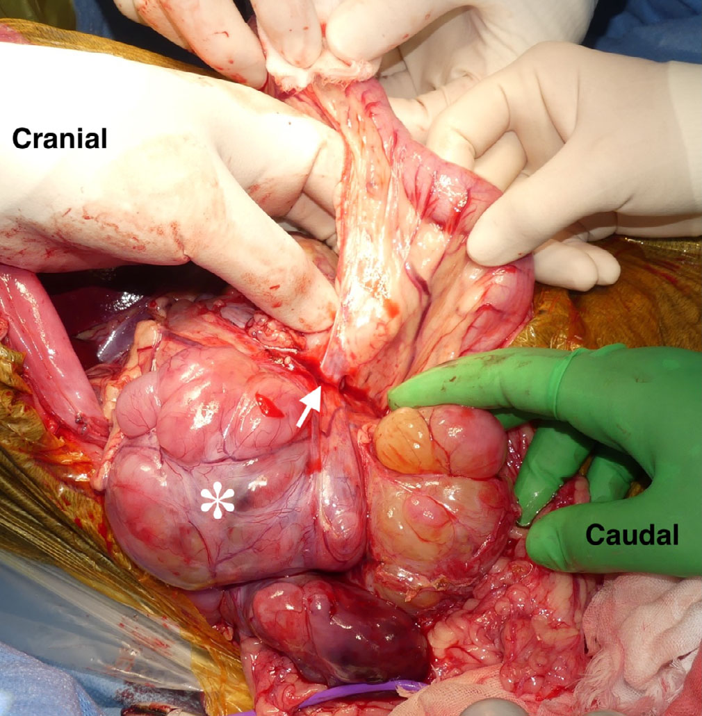 ↑ 术中发现。巨大的肿块(*)被发现与十二指肠韧带(白箭头)和胰腺右叶粘连。