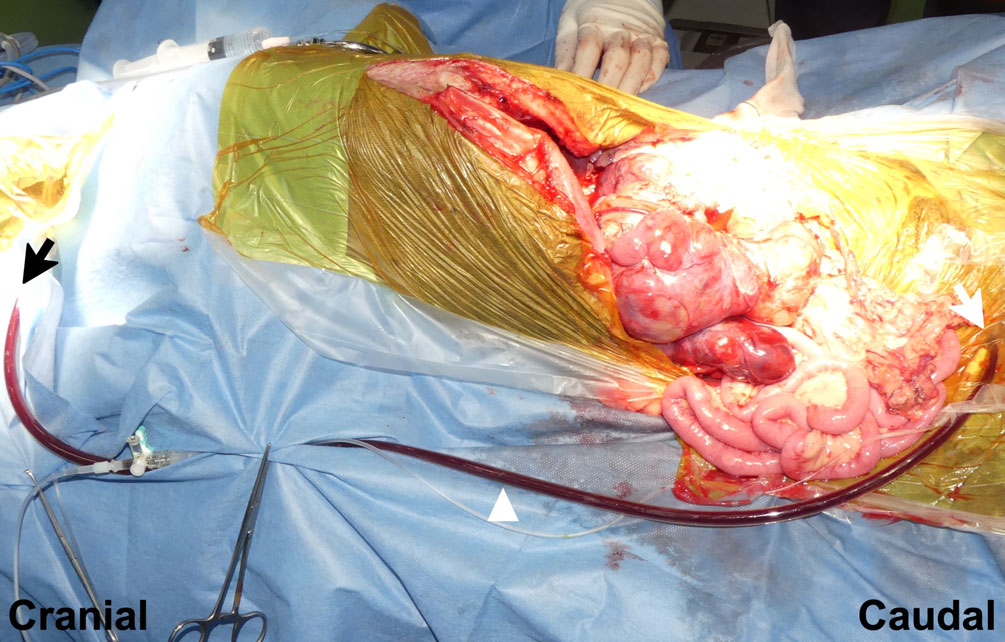 ↑ 在右侧颈静脉和股静脉之间建立静脉-静脉旁路。一根预先充满生理盐水的Anthron旁路管被插入右侧股静脉(白箭头),另一根充满生理盐水的旁路管以类似方式被置入右侧颈静脉(黑箭头)。然后将这两根管连接形成一个单一通道,从而在股静脉和颈静脉之间创建了一个临时的腔静脉旁路。