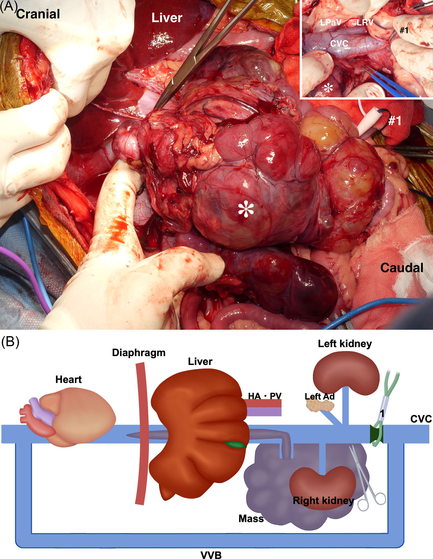 ↑ 从腔静脉(CVC)的尾侧分离肿块的尾侧。(A)术中发现。(B)示意图。(A)的右上角图像显示在止血带(1号)收紧时从腔静脉分离肿块(*)。止血带(1号)收紧后,对整个肿块(*)进行了大体检查,并小心地从腔静脉分离至左肾静脉的头侧。Ad,肾上腺;HA,肝动脉;LRV,左肾静脉;LPaV,左侧膈下腹静脉;PV,门静脉;VVB,静脉-静脉旁路。