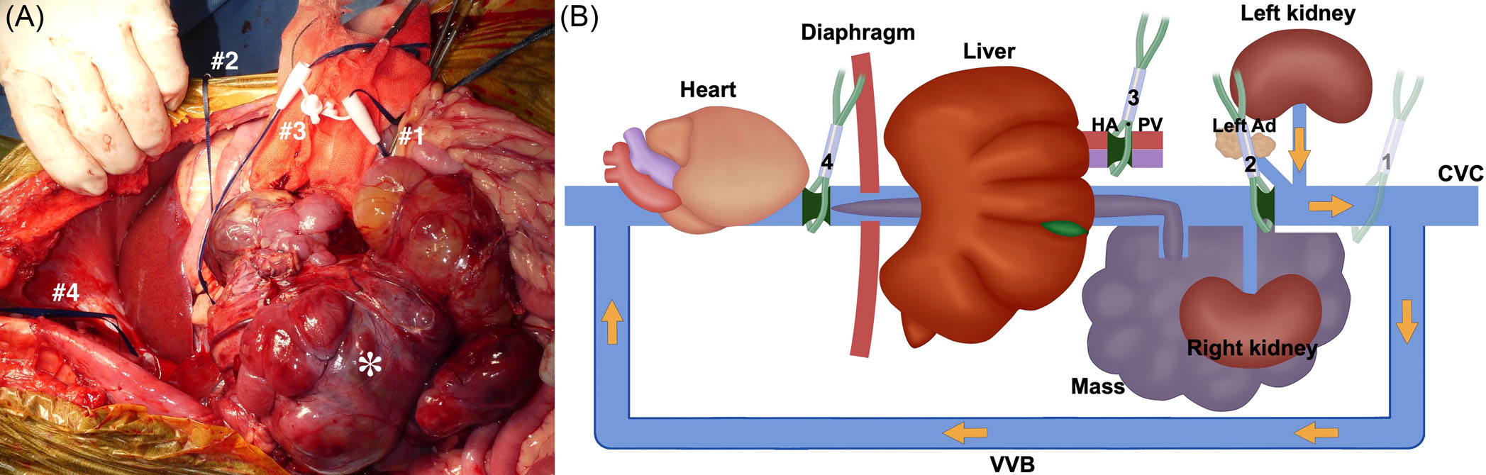↑ 用于从腔静脉(CVC)分离肿块的止血带(1–4号)的应用位置。(A)术中发现。(B)示意图。止血带依次阻断血流的顺序如下:左肾静脉和膈下腹静脉头侧的腔静脉(2号)、Pringle操作(3号)和胸腔腔静脉(4号)。随后释放位于肿块(*)尾侧的腔静脉上的止血带(1号)。在这些阻断期间,通过静脉-静脉旁路(VVB)维持左肾的静脉回流,如(B)中黄色箭头所示。然后在靠近右侧膈下腹静脉的腔静脉处切开以移除腔静脉血栓。Ad,肾上腺;HA,肝动脉;PV,门静脉。