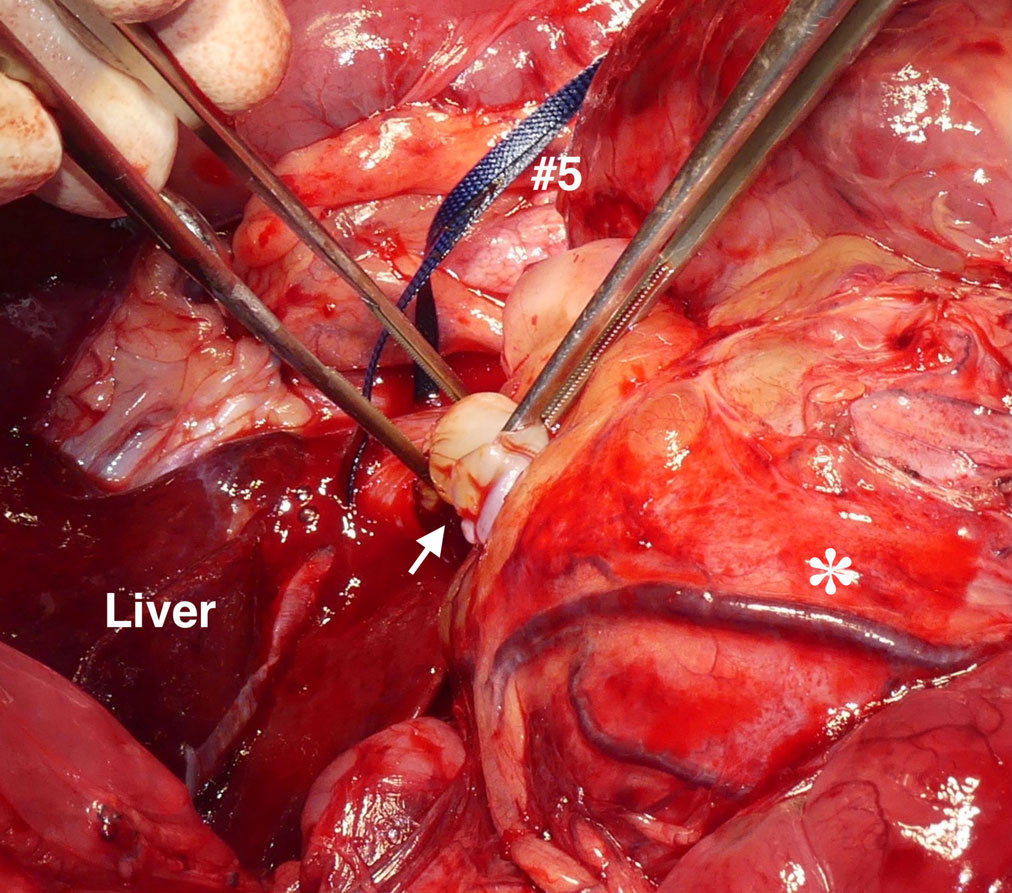 ↑ 腔静脉血栓的手术切除。在靠近右侧膈下腹静脉的腔静脉切开后,在肝脏和腔静脉切口之间放置了一个新的止血带(5号)。随后从腔静脉切口处移除了腔静脉血栓(白箭头)。