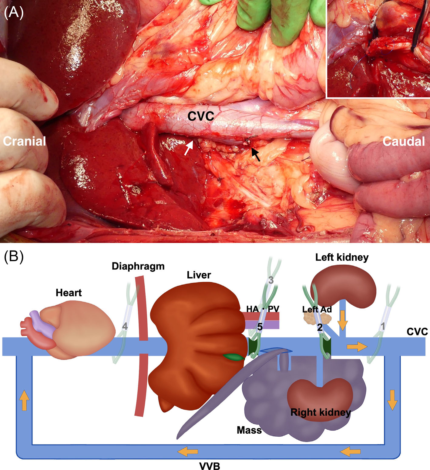 ↑ 带腔静脉血栓的肿瘤切除及腔静脉(CVC)重建。(A)术中发现。(B)示意图。在从腔静脉移除血栓后,立即使用止血带(5号)阻断肝后腔静脉,如B所示。随后释放止血带(3和4号),允许门静脉和肝动脉血液灌注肝脏并通过肝静脉流入腔静脉。右肾静脉(黑箭头)被结扎和切断,从而能够将涉及右肾的肿瘤整块切除。腔静脉的切开部位(白箭头)随后采用5-0聚丙烯线进行连续缝合重建。图A右上角显示了连续缝合的重建情况。重建后,释放剩余的止血带(2和5号),未见出血。Ad,肾上腺;HA,肝动脉;PV,门静脉;VVB,静脉-静脉旁路。