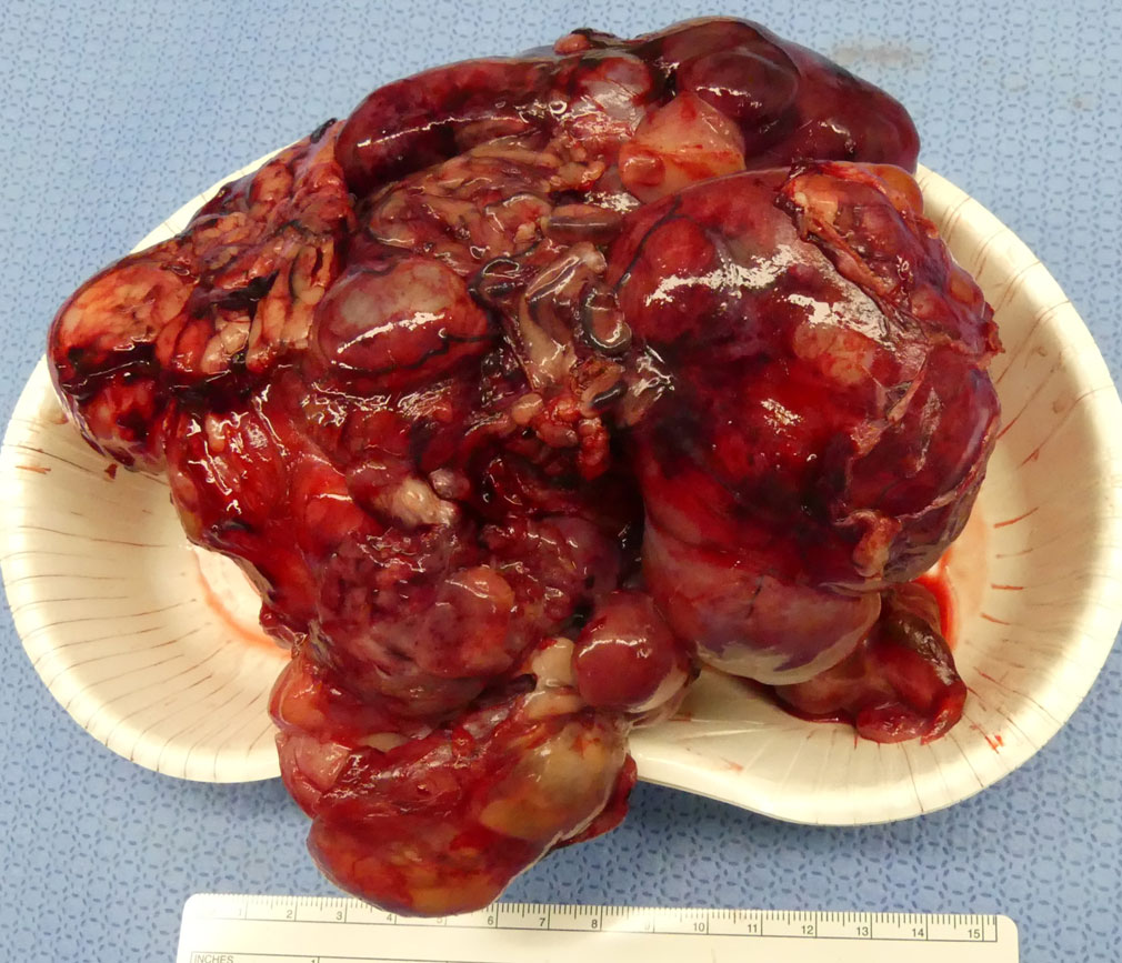 组织病理学检查显示,巨大肿块为腹膜后肉瘤。肿瘤重953克,最大直径为16.5厘米,体重比为5.5%(下图)。肿瘤内部有广泛的出血和坏死。肿瘤累及右侧肾上腺,组织病理学检查确认其侵犯肾上腺组织并浸润肾周脂肪。腔静脉内的肿块长度为8.4厘米,起源不明,主要由结缔组织构成,细胞成分极少。