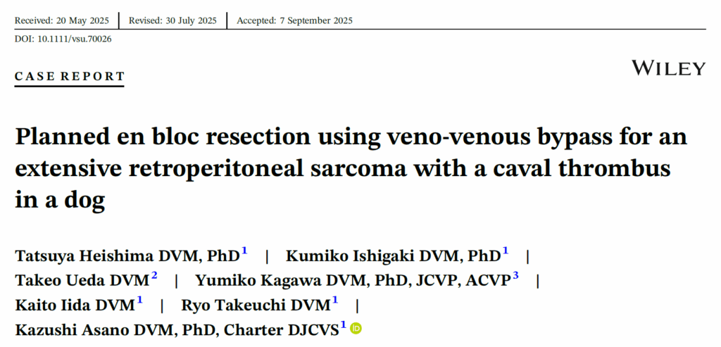 文献来源:Heishima T, Ishigaki K, Ueda T, Kagawa Y, Iida K, Takeuchi R, Asano K. Planned en bloc resection using veno-venous bypass for an extensive retroperitoneal sarcoma with a caval thrombus in a dog. Vet Surg. 2025 Sep 18.