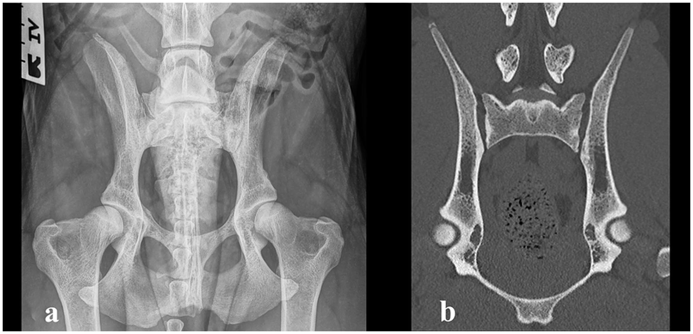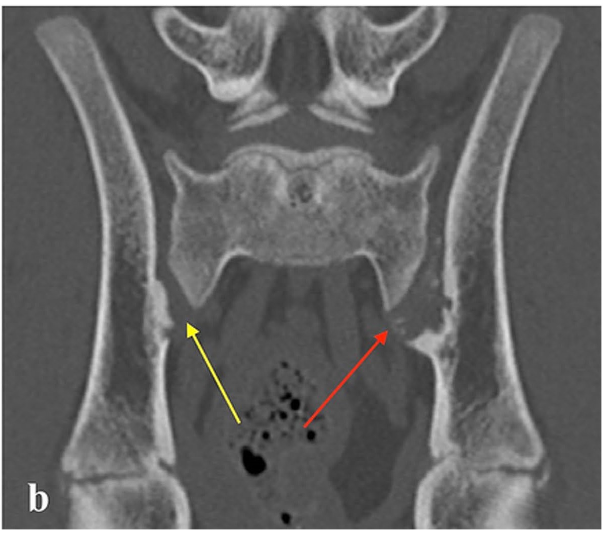 1.5年后,主人报告称该犬保持正常的活动能力,没有临床不适。触摸骶髂关节和腰骶部时无疼痛表现。髋关节的活动范围正常且无疼痛。临床上观察到轻度跗骨外旋。X光和CT未显示侵蚀性或硬化性病变的迹象,骶髂关节的外观被认为是正常的(下图)。在国际犬联官方的髋关节发育不良筛查中,髋关节被评定为D/D(中度髋关节发育不良)。