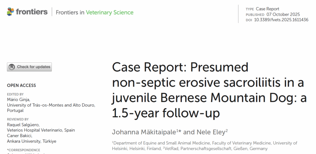文献来源:Mäkitaipale J, Eley N. Case Report: Presumed non-septic erosive sacroiliitis in a juvenile Bernese Mountain Dog: a 1.5-year follow-up. Front Vet Sci. 2025 Oct 7;12:1611436.