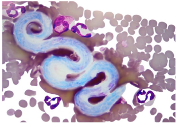血涂片检查发现大量形态符合丝虫的微丝蚴(图1)。
