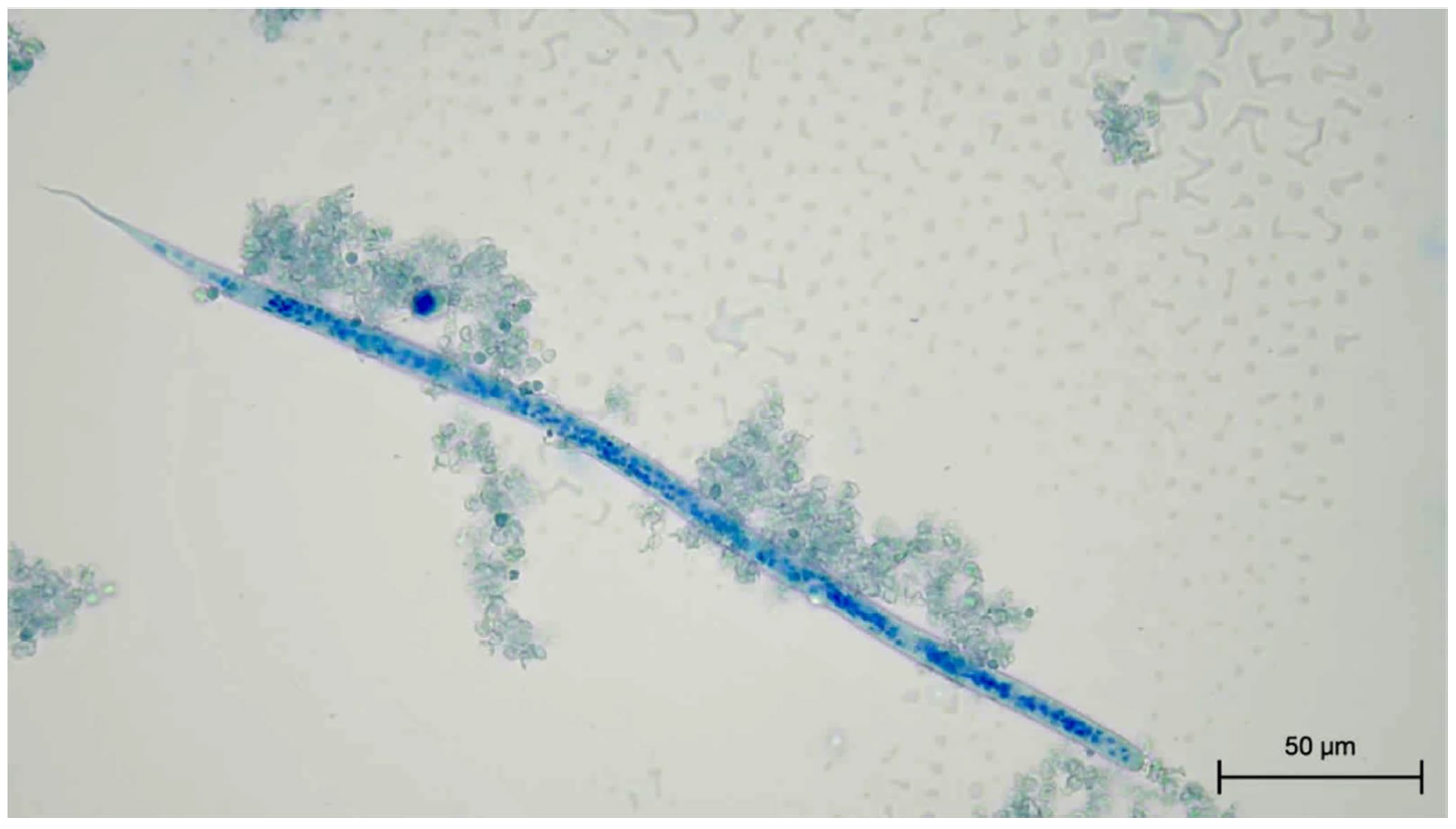 图2. 改良Knott试验:猫血样中的微丝蚴经2%甲醛固定、亚甲蓝染色,可见弯曲尾部、钝圆头部及3个头端核。