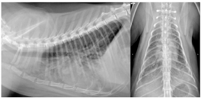 第18天,由于担心微丝蚴死亡导致呼吸急促,额外开具了泼尼松龙(2 mg/kg),但药物未被主人领取。当晚因急性呼吸窘迫发作而被送往急诊科,呼吸频率92次/分,氧饱和度83%,X光显示弥漫性肺间质纹理(图4)。猫被收治入院,接受氧疗(15 L/min)、地塞米松(0.1 mg/kg,静脉注射,q12h)以及氨苄西林-舒巴坦(30 mg/kg,静脉注射,q8h)。