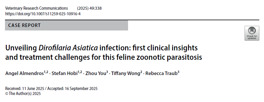 文献来源:Almendros A, Hobi S, You Z, Wong T, Traub R. Unveiling Dirofilaria Asiatica infection: first clinical insights and treatment challenges for this feline zoonotic parasitosis. Vet Res Commun. 2025 Sep 30;49(6):338.