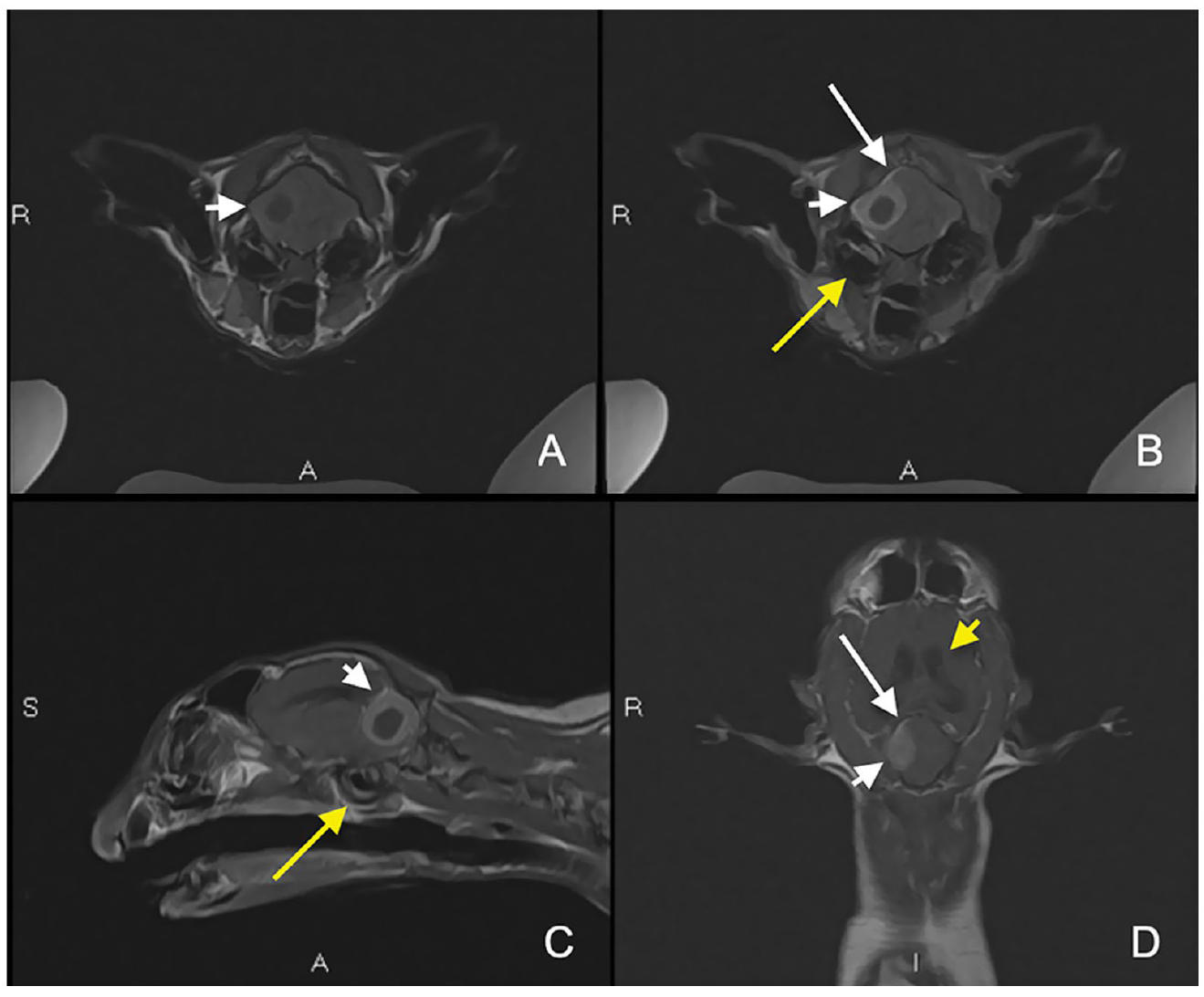 ↑ MRI显示右侧颅后窝内的脑外腔隙性肿块,伴有硬膜尾征(长白色箭头)。未增强T1W轴位(A)、增强后T1W脂肪抑制轴位(B)、增强后T1W矢状位(C)和背侧位(D)图像显示一个基底宽广、边界光滑的肿块,其中央区域在T1W呈低信号且不强化,周围环绕着一层较大的强对比增强组织(短白色箭头)。还注意到轻度中耳炎(长黄色箭头)和脑室扩大(短黄色箭头)。