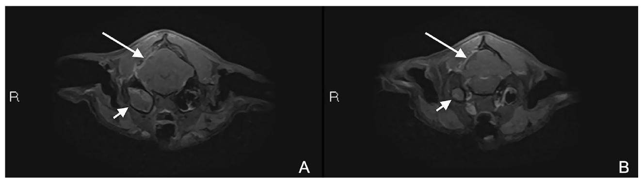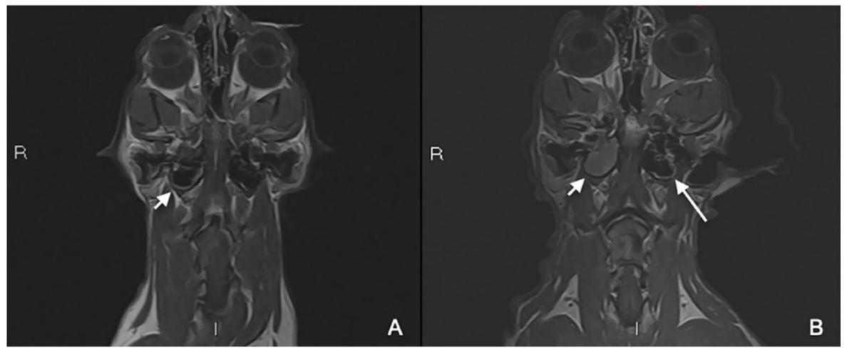 ↑ 术前(A)和术后两个月的MRI检查(B)。增强后T1W背侧图像(AB)显示右侧中耳炎进展(短白色箭头)和疑似左侧早期中耳炎(B,长白色箭头)。