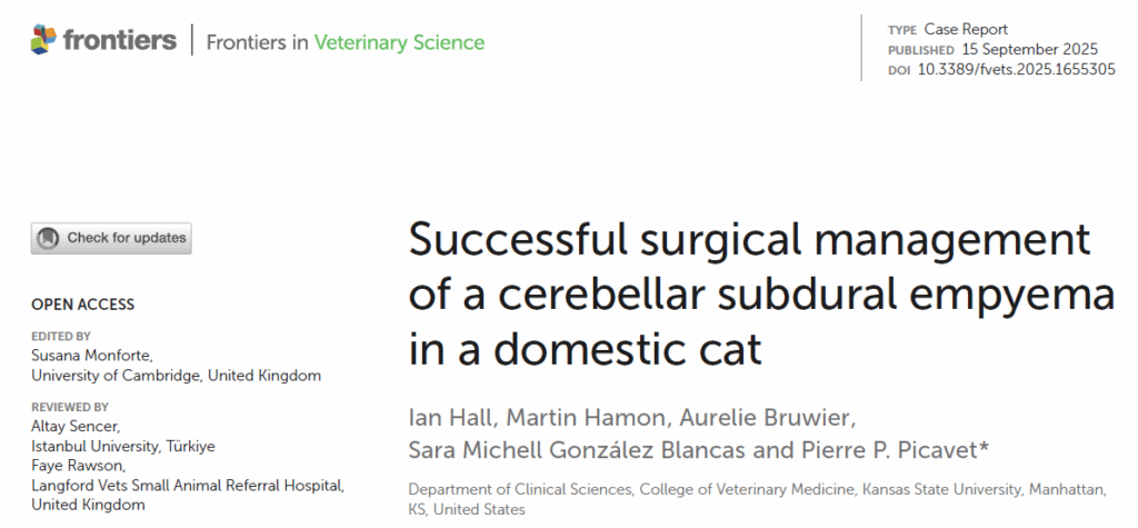 文献来源:Hall I, Hamon M, Bruwier A, González Blancas SM, Picavet PP. Successful surgical management of a cerebellar subdural empyema in a domestic cat. Front Vet Sci. 2025 Sep 15;12:1655305.